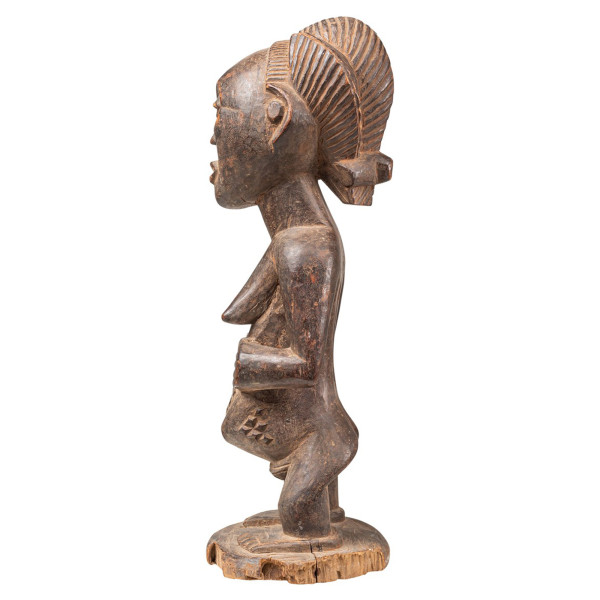 Ta przodkowa postać żeńskiej Hemby, pochodząca z XX wieku i pochodząca z DR Konga, ucieleśnia tradycję z rękami umieszczonymi na pępku i uchylonymi oczami. Odpowiedzialny za szlachetność przodków, symbolizuje duchową moc, wzmacniając rodowód rodzinny podczas niezbędnych ceremonii. Piękne skaryfikacje na brzuchu dodają znaczącego artystycznego wymiaru temu unikalnemu kawałkowi naturalnego drewna o wymiarach 18,5x20x57,5 cm. Jako duchowy pojemnik ułatwia połączenie światów zmarłych i żywych, świadcząc o głębokim dziedzictwie kulturowym plemienia Hemba w