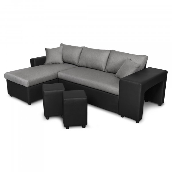 Dla maksymalnego komfortu i estetyki w salonie, ta narożna sofa Maria Plus jest idealna na powitanie gości. Przyniesie ciepło i nowoczesny wygląd dzięki tkaninie i materiałowi ze sztucznej skóry zbudowanej z litego drewna, płyty wiórowej i metalu z szarymi i czarnymi kolorami. Ta narożna sofa jest wysokiej jakości dzięki wielofunkcyjnym funkcjom, takim jak dodatkowe łóżko, schowek i 2 pufy z rozkładanym i dwustronnym fotelem wypoczynkowym. Ten szary i czarny mebel ma wymiary 148x241x71 cm przy wysokości siedziska 44 cm i doskonale staje się centrum intencji w pomieszczeniu.