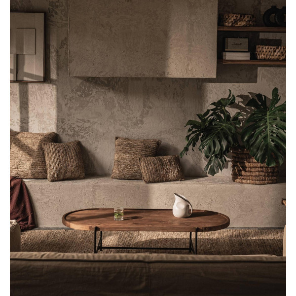 Coco to piękny owalny stolik kawowy z podniesioną krawędzią, wykonany z wysokiej jakości odzyskanego drewna tekowego i tradycyjnie obrabiany przez naszych wykwalifikowanych rzemieślników. Smukła czarna żelazna rama z mosiężnymi detalami na górze uzupełnia współczesny wygląd stołu.