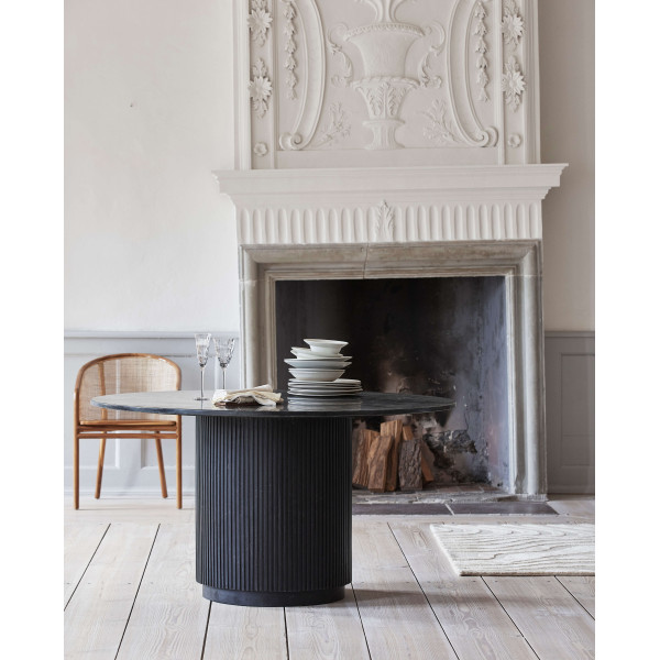 Ten okrągły stół jadalny Erie doda wnętrzu współczesnego akcentu. Ten naturalny marmurowy blat ma piękną grę, która przyciąga wzrok wszystkich. Jego wyjątkowa podstawa z litego drewna mango przyniesie temu stołowi długowieczność.