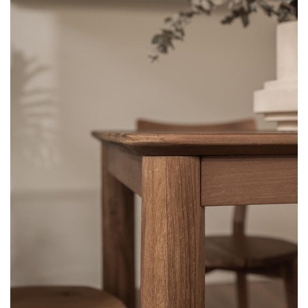Kwadratowy stół do jadalni Dino to praktyczny wybór do każdego pomieszczenia, w którym przestrzeń jest ograniczona. Wykonany z odzyskanego drewna tekowego, blat stołu, z eleganckimi i praktycznymi fazowanymi i zakrzywionymi krawędziami, spoczywa bezpiecznie na masywnych toczonych nogach podstawy. Minimalne wykończenie drewnianej powierzchni nadaje stołowi Dino rustykalny i żywy charakter.