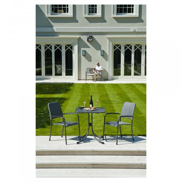 Ten kwadratowy stół Portofino w kształcie kwadratu od Alexander Rose został zaprojektowany w stylu bistro. Ten stół z centralną nogą jest idealny do spotkania się na miłe chwile. Mierzy 70x70x74 cm i ma szary kolor. Jest nienaganny i stylowy dzięki chroniącemu przed rdzą konstrukcji stalowej. Jest to stół do użytku na zewnątrz i wewnątrz.