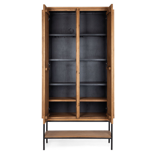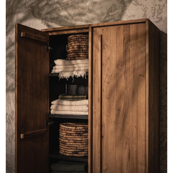 O guarda-roupa Outline é uma peça de mobiliário elegante com um design limpo e uma carpintaria impressionante. Ele se encaixa facilmente em qualquer estilo de interior. As duas portas se abrem para revelar cinco prateleiras de cada lado para guardar suas coisas de forma organizada e discreta; a última prateleira está aberta. O armário é feito à mão em teca e ferro recuperados. Ele mede 94x42,5x195 cm.