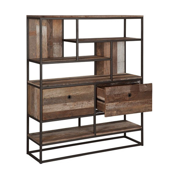 Estante com uma estrutura de metal preto e teca reciclada, revelando resíduos de cores.