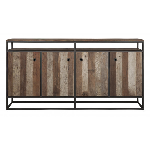 O buffet Touareg é feito de madeira de teca reciclada e tem uma estrutura de metal preto. As dimensões do buffet são 178x40x90 cm. Ele possui 4 portas e uma prateleira aberta.
