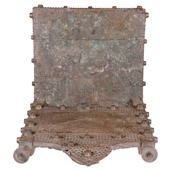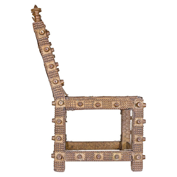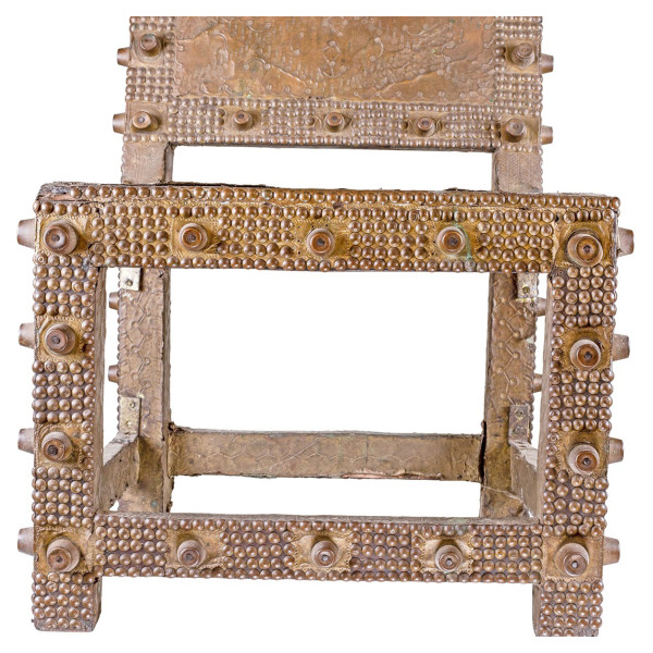 Esta cadeira cerimonial Chokwe, originária da República Democrática do Congo, é uma verdadeira obra-prima do século XX. Ele mede 42 x 43,5 x 79 cm e é feito de madeira e cobre. As cadeiras cerimoniais Chokwe eram tradicionalmente usadas por chefes e oficiais durante cerimônias importantes. Eles eram um símbolo de status social e poder.