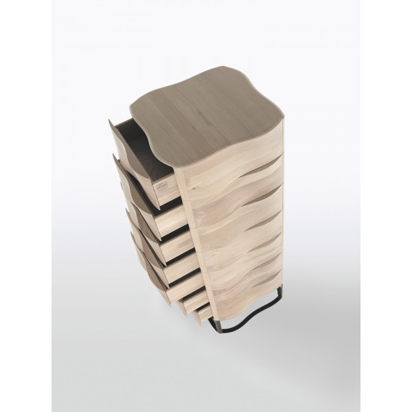 A cômoda Touch tem uma silhueta arredondada que revela a flexibilidade e a beleza da madeira. Ela desperta o desejo de tocá-la para apreciar suas curvas. Projetada para fins de armazenamento, este objeto apela aos sentidos e aos gostos mais sofisticados. Este móvel fabricado em madeira maciça de carvalho é uma criação do Suricata Design Studio da marca Wewood. Suas medidas são 54,5x54,5x147,5 cm.