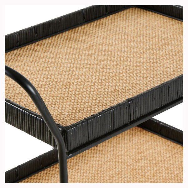 Este aparador Mouti é cuidadosamente feito usando uma mistura de materiais de alta qualidade. É feito de madeira compensada férrica forte, durável e rattan natural. Com suas dimensões funcionais e práticas de 70x39x85 cm, este carrinho oferece espaço de armazenamento adicional para as necessidades diárias. É colorido em preto e natural, criando um contraste estético e atemporal. Este aparador versátil e elegante adicionará um toque de charme à sua casa, ao mesmo tempo em que fornece uma solução prática de armazenamento para itens essenciais.