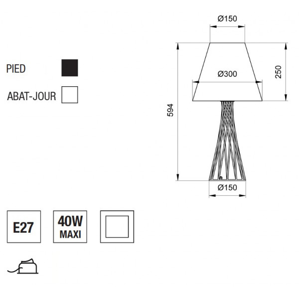 Inspirada nas crinolinas de antigamente, esta luminária de mesa encanta com sua base em volutas de aço. Funciona com uma lâmpada E27 não fornecida e é composta de aço laqueado epóxi e tecido colado.