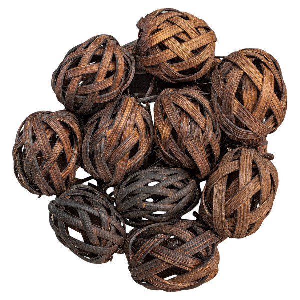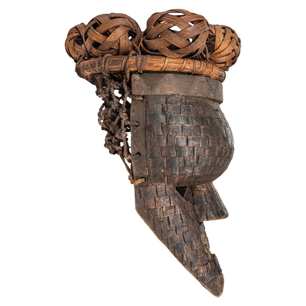 A máscara Mukinka Salampasu se distingue por sua testa abobadada coroada com uma bengala circular, coberta por bolas de vime formando um denso cocar. Seu rosto tem um nariz dilatado, dentes pontudos e uma rede de faixas de cobre, evocando a cerimônia de guerra. Usadas em funerais e iniciações, algumas máscaras eram temidas a ponto de aterrorizar mulheres e crianças. Medindo 21x37x21,5 cm, esta peça única é feita de madeira e ráfia, datada de meados do século XX, originária do Zaire, na tribo Salampasu.