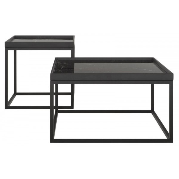 A mesa de centro MUST Living Cube está disponível em dois tamanhos. A mesa tem um tampo de vidro de mármore preto.