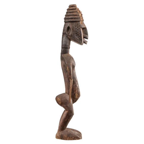 Esta escultura Bambara do Mali representa uma figura masculina em pé que data de meados do século XX, medindo 21,5x24,5x81,5 cm, feita de madeira natural. É extremamente detalhado, com um chapéu em forma de cabana tradicional, o que pode indicar status social ou significado ritual. Como as figuras masculinas são menos comuns na arte bambara, essa peça pode ter uma importância cultural particular, possivelmente relacionada à representação de ancestrais ou espíritos. A delicadeza da escultura e os padrões gravados refletem a experiência artesanal do povo