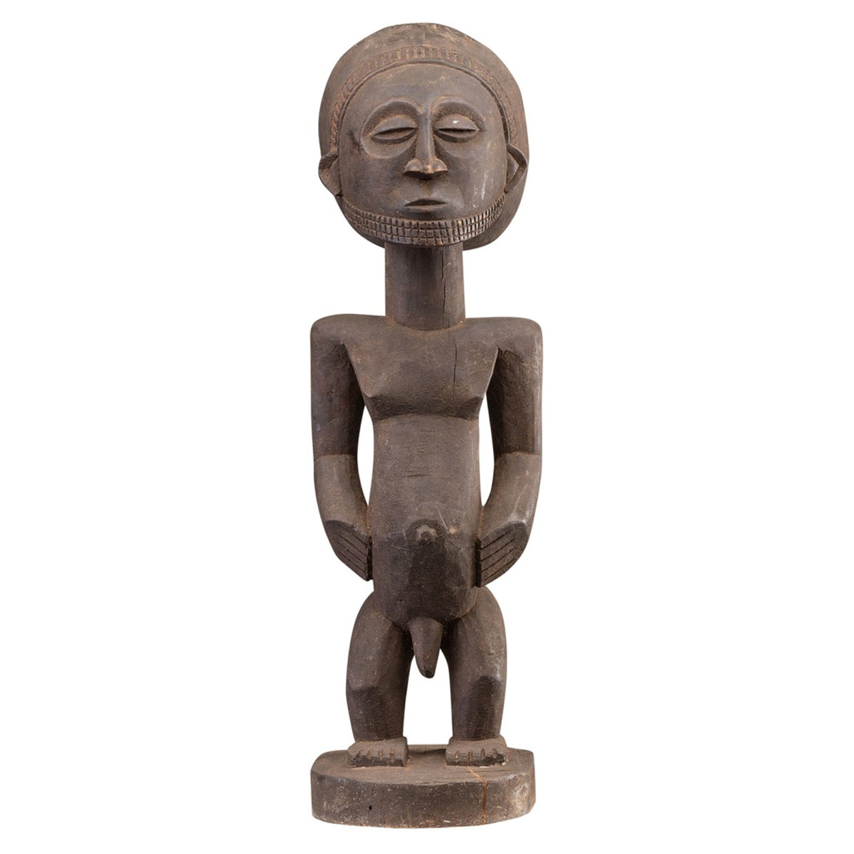Essa representação icônica de um ancestral Hemba, datado do século XX e nativo da República Democrática do Congo, adota uma postura clássica, com as mãos apoiadas no umbigo e os olhos semicerrados. Tem a marca da nobreza ancestral, fortalecendo os laços familiares durante cerimônias cruciais. Como receptáculo espiritual, facilita a conexão entre os mundos dos mortos e dos vivos. Esculpida em madeira natural, esta peça única medindo 30x25x87 cm incorpora elegantemente a herança artística e espiritual da tribo Hemba, assumindo um significado profundo e