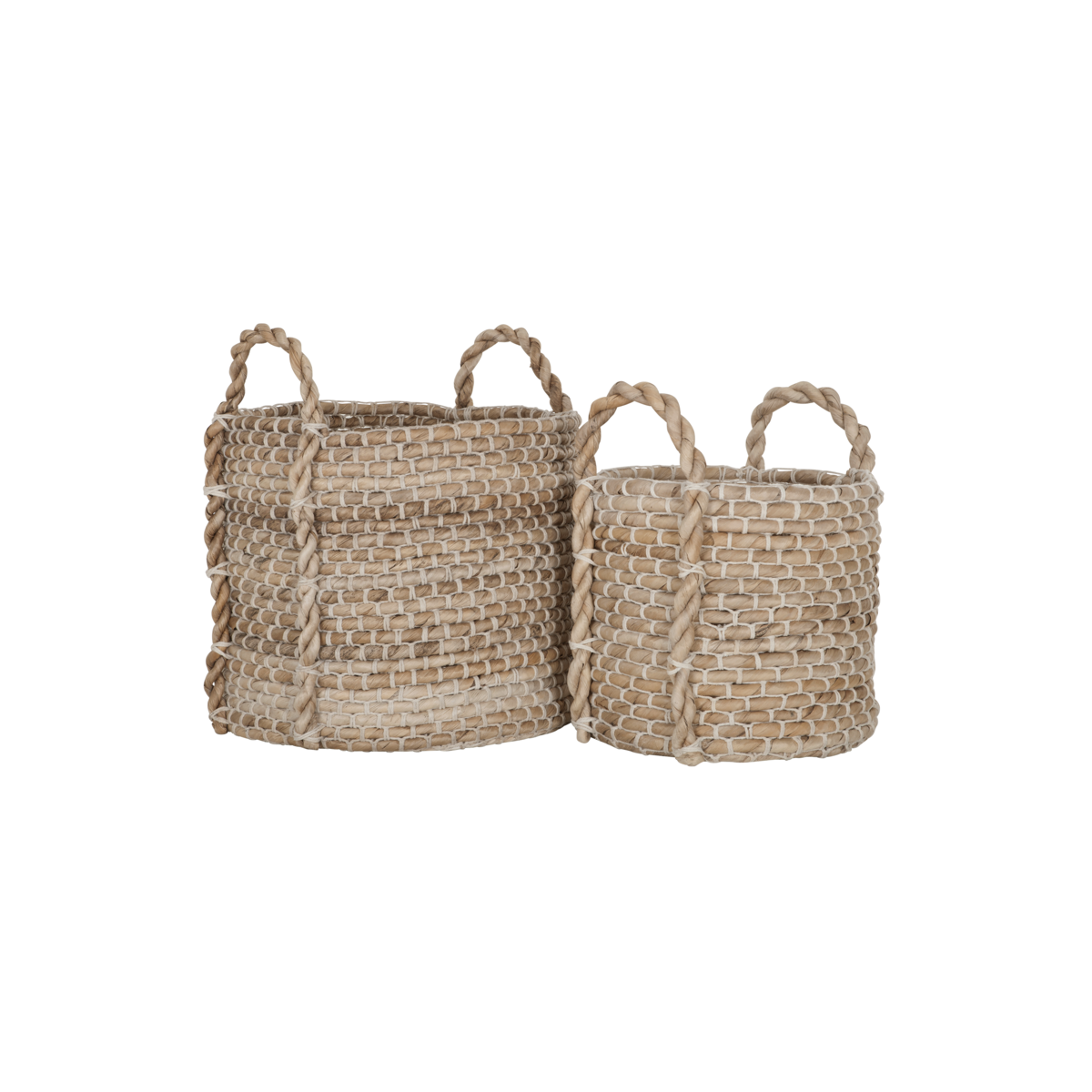 Setul de coșuri MUST Living Patio este fabricat din materiale naturale: Abaca (o specie de bananier originară din Filipine și care crește și în Indonezia) și sfoară de bumbac. Coșurile măsoară Ø35x32 cm și Ø45x40 cm.