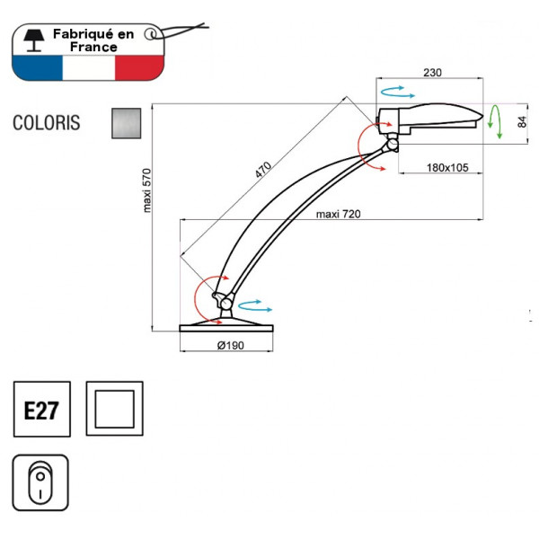 Lampa de birou Space are o personalitate puternică. Dispune de un braț orientabil și înclinabil din aluminiu. Capul său orientabil este realizat din polipropilenă translucidă și baza sa ponderată din oțel epoxidic gri. Comutatorul on/off este pe reflector. Acest produs este fabricat în Franța și livrat fără bec (soclu: E27). Lampa este compusă din oțel, aluminiu și material sintetic.