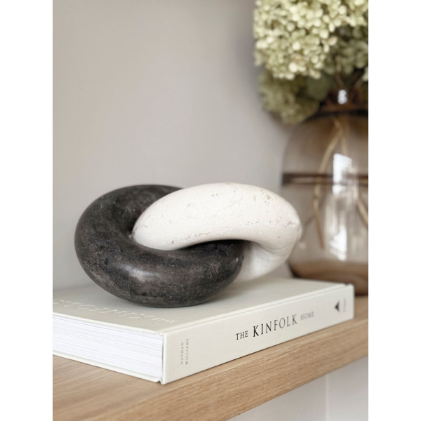 Această sculptură abstractă „Lanț rotund” este o piesă unică și intrigantă. Fabricat în întregime din marmură albă și neagră, reprezintă un lanț înfășurat pe sine. Are o dimensiune de 22x16x16 cm. Contrastul dintre cele două culori alb și negru creează un efect vizual izbitor, subliniind formele curbate și sinuoase ale sculpturii.