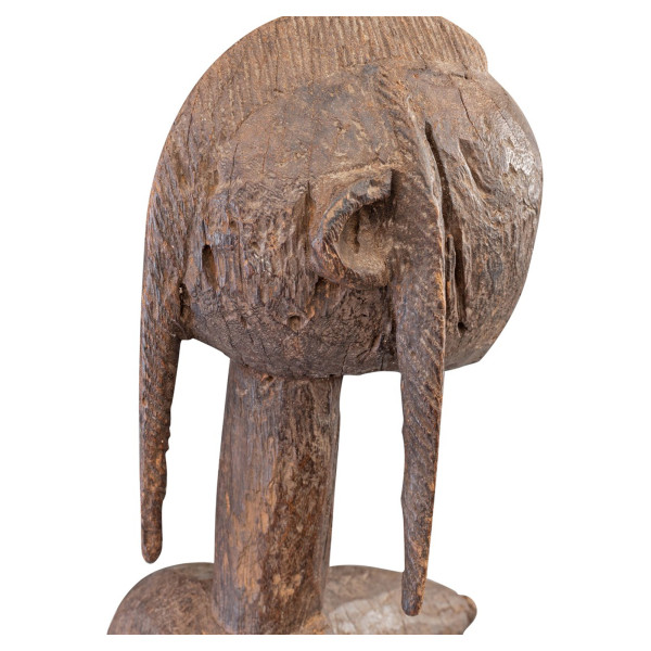 Figurina Dyonyeni, din tribul Bambara din Mali, este un exemplu magnific de artă și cultură africană. Creat la mijlocul secolului XX, are dimensiuni de 23,5x17,5x77 cm. Această lucrare unică este sculptată cu finețe în lemn natural, evocând imaginea unei figuri feminine. Stând în picioare, cu brațele ridicate, ea întruchipează grația și eleganța. Pieptul ei este delicat conic și rotunjit, în timp ce fața ei ovală, armonioasă, este decorată cu ochi mari, expresivi și o gură zâmbitoare. Părul figurinei este atent modelat, adăugând caracterul său distinct. Simbolizează fertilitatea și viața, reflectând astfel valorile de bază ale tribului Bambara. Această piesă unică este o adevărată sărbătoare a moștenirii artistice africane.