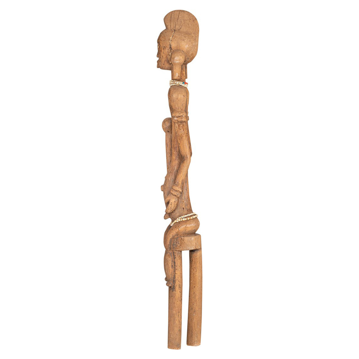 Statuia tribală Mumuye, opera sculptorului Rati sau Molabaiene, fascinează cu brațele sale lungi pendulare cu mâini spatulate și un ombilic proeminent. Purtat de un guler masiv, capul îngust prezintă coafura distinctivă a clanului și urechile extinse de cercei, rezervate femeilor. Unic, realizat din lemn natural, cu o dimensiune de 17x18,5x122,5 cm, datat la mijlocul secolului al XX-lea, originar din Nigeria în tribul Mum