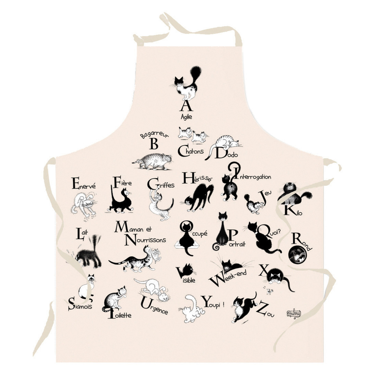 Șorțul „Alfabet” este ilustrat cu alfabetul și pisicile. Conceput în bumbac 100% și fabricat în Franța, acest șorț vă oferă o protecție elegantă. Combină perfect estetica și caracterul practic și poate fi spălat cu ușurință la 40°C, are o dimensiune de 72x48 cm și colorat în ecru.