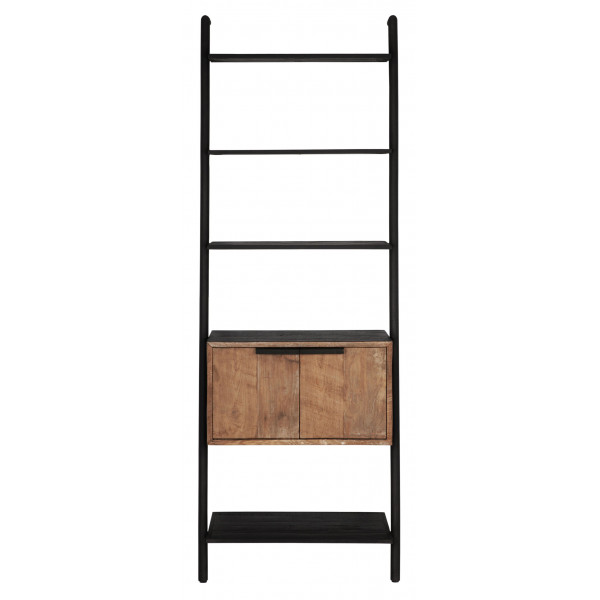 Väggstöd Cosmo är tillverkat av naturligt teakträ och har en struktur i svart metall. Denna förvaringsmöbel har 4 hyllor och 2 dörrar och mäter 70x35x200 cm.