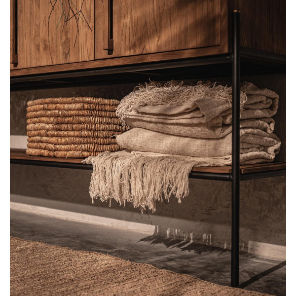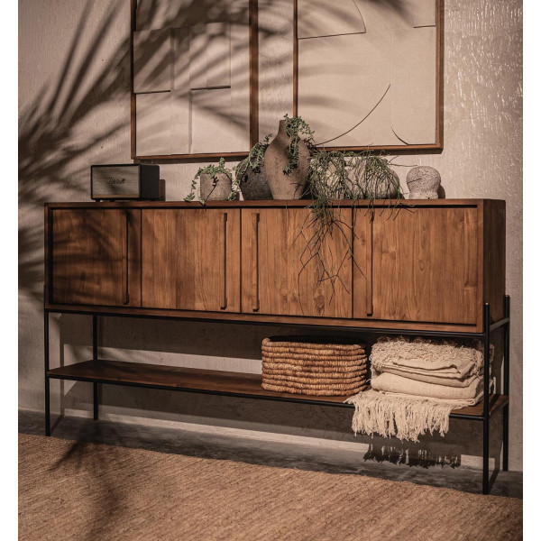 Outline skänk är en stor modern lagringsenhet med en ren design som enkelt anpassar sig till alla inredningsstilar. Handgjord av återvunnet teakträ, den har en elegant järnram som förstärker dess moderna utseende. Bakom varje dörr finns två hyllor, vilket gör den idealisk för förvaring av disk, leksaker eller något annat. Dess dimensioner är 189x38x100 cm.