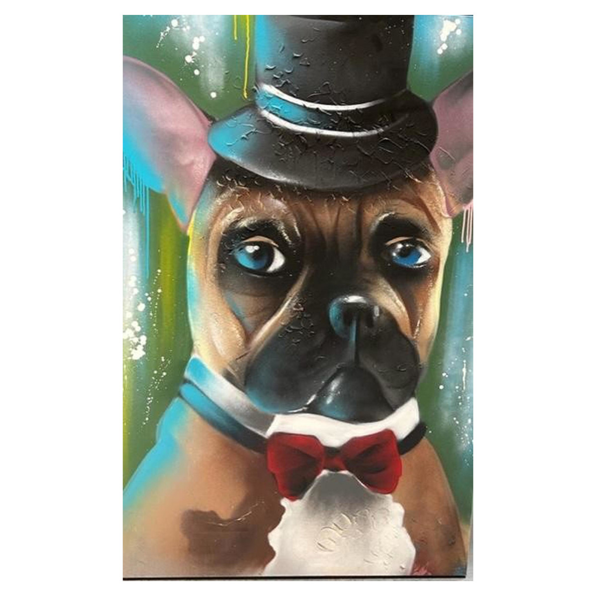 Detta konstverk visar ett fängslande porträtt av en framstående hund, elegant klädd med en klassisk svart topphatt och en ljusröd fluga, vilket ger honom ett raffinerat gentlemanutseende. Konstnären, Keusty, fångade essensen av hundadel genom detta stycke, målning med anmärkningsvärd behärskning på duk, för att skapa en bild som är både realistisk och unik. Arbetets mått, 80x120 cm, gör det till en bit av stor storlek, som kan fånga ögat och lägga till en touch av sofistikering till vilket utrymme som helst. Denna skapelse är en sann hyllning till individualitet, som finns i en enda upplaga, vilket garanterar dess exklusivitet. Valet av färger, den skickliga penseltekniken och spelet av ljus och skugga kombineras för att göra denna duk till ett önskvärt och oändligt konstobjekt, som lovar att bli samlingspunkten för alla konstsamlingar eller smakfullt inredda interiörer.