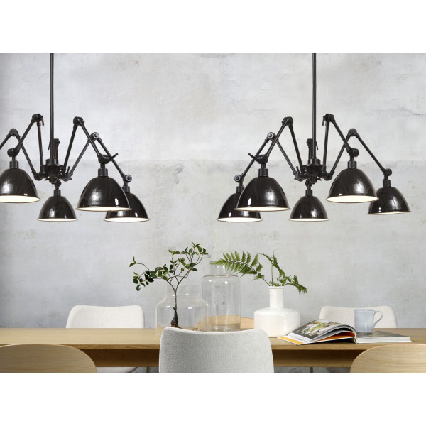 Hänglampan Amsterdam i järn med 5 leder ger en modern industriell look till ett interiör. Denna lampa kännetecknas av en justerbar höjd från 45 till 120 cm, en längd på 160 cm samt en bas på 11,5 cm x 6 cm. Den har en E27-sockel (glödlampa ingår ej).