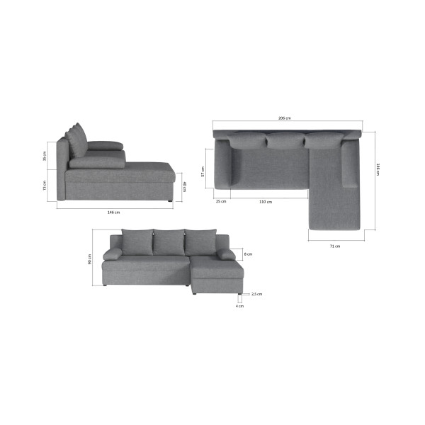 Denna multifunktionella Gino hörnsoffa delar också ett vackert utseende och erbjuder en hög nivå av komfort. Tygklädseln, plastbasen med en möbelreglage som används för att skapa denna möbel kommer att förbättra interiören med ett attraktivt och unikt utseende. Den finns i en total storlek på 206x146x90 cm som passar lätt in i det tillgängliga utrymmet i sovrummet och en sitthöjd på 40 cm, som kan omvandlas till en 206x120 cm säng. Att välja färg på tyget gör det enkelt att välja den finish som matchar rumets stil för att skapa en vacker och harmonisk atmosfär i inredningen.