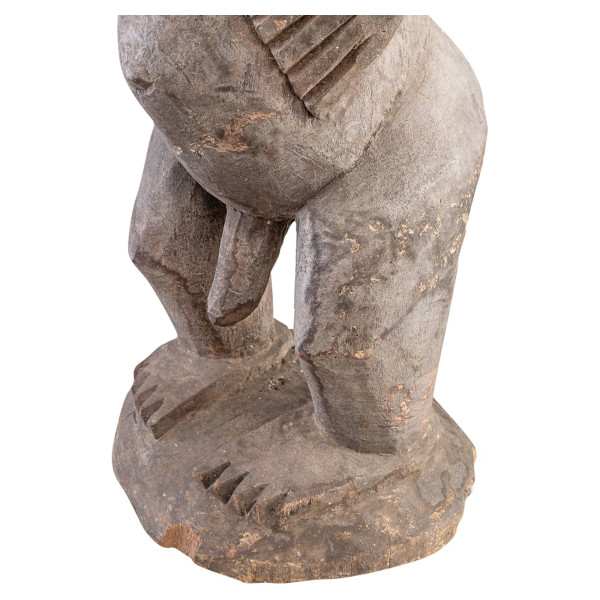 Denna förfäderliga Hemba-figur, från 1900-talet och infödd i DR Kongo, har en förfader med händerna placerade på naveln och ögonen på glänt. Genomsyrad av förfädernas adel förstärker den familjelinjen, som ofta visas under viktiga ceremonier. Som en andlig behållare underlättar den sambandet mellan de dödas och de levandes värld. Detta unika stycke är snidat av naturligt trä och mäter 27x26x89,5 cm och förkroppsligar Hemba-stammens konstnärliga och andliga arv