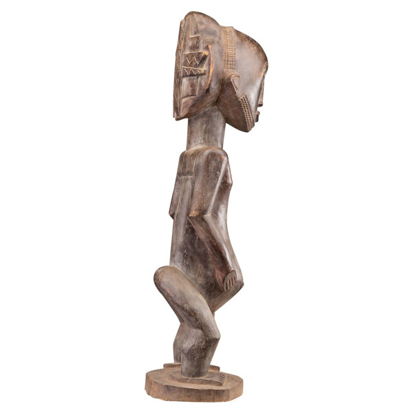 Denna Hemba-skulptur, från 1900-talet i Demokratiska republiken Kongo, mäter 13,5x28x99 cm. Det representerar en klassisk Hemba-förfader, med händerna placerade på naveln, ögonen på glänt, framkallar förfädernas adel och förstärker familjens härstamning. Dessa siffror presenterades vid viktiga ceremonier och befäste därmed familjens ställning. Som en andlig behållare underlättar denna skulptur sambandet mellan de dödas värld och de levande, och förkroppsligar den rituella och kulturella betydelsen av naturligt trä Hem
