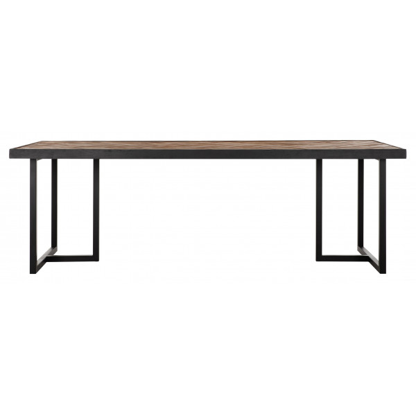 Matbordet Criss Cross består av en bordsskiva av trä och en ram av metall som fungerar som ben. Bordet finns i flera storlekar.