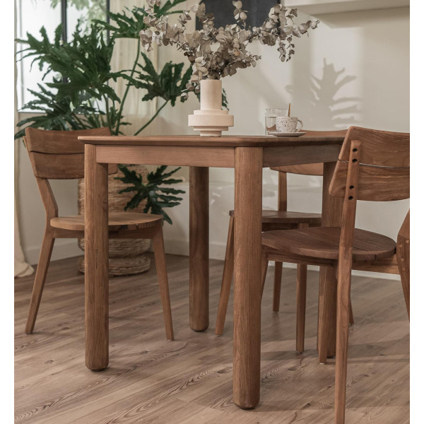 Dino square matbord är ett praktiskt val för alla rum där utrymmet är begränsat. Tillverkad av återvunnen teak, bordsskivan, med sina eleganta och praktiska fasade och böjda kanter, vilar säkert på massiva svängda basben. Den minimala finishen på träytan ger Dino bordssortimentet en rustik och levande karaktär.