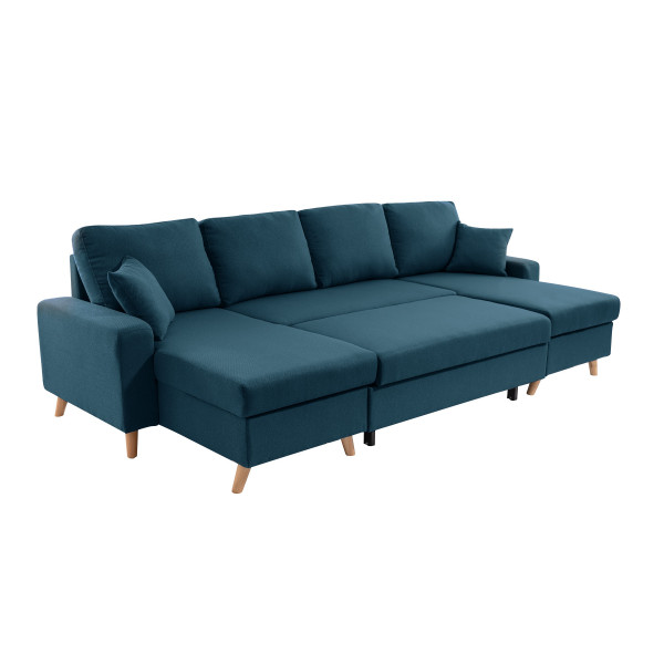 Den panoramiska soffan Artiku i skandinavisk stil passar enkelt in i alla inredningsstilar. Dess funktioner är många: två stora förvaringslådor under schäslongerna och en bäddsoffa för att rymma 2 personer. Med sitt vattenavvisande tyg som skyddar mot fläckar är det den perfekta soffan för att ta emot vänner och familj! Dess olika varianter av klädsel och färger gör att du kan välja exakt den stil som passar ditt hem.