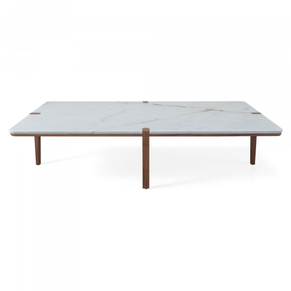 Soffbordet Corner rektangulär designades av formgivaren Pierre Dubourg för att bryta den klassiska placeringen av bordsbenen på de flesta bord, genom att placera dem på ställen som säkerställer stabilitet och lämnar hörnen fria. Detta exklusiva bord är tillverkat av ben och en bas i massiv valnöt och en bordsskiva i marmor.