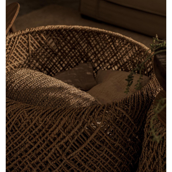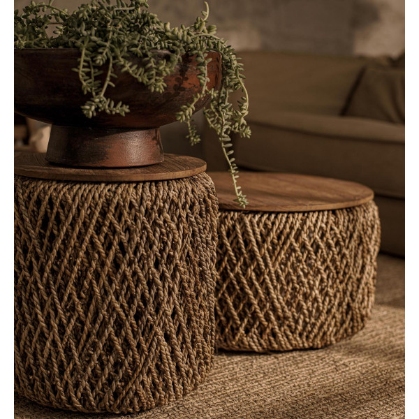 Denna uppsättning Knut soffbord är en rolig och funktionell uppsättning bestående av tre små bord i storlekarna 55x55x31 cm, 70x70x36 cm och 40x40x41 cm. Dessa mångsidiga bitar kan användas som bord, poufor, eller för dekoration. Genom att ta bort toppen kan de till och med användas som korgar. Borden är gjorda av miljövänliga material, med sidor dekorerade med handflätade abaca-fibrer och en avtagbar topp gjord