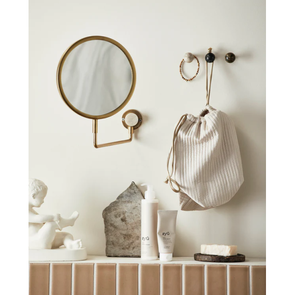 Denna vackra runda mässing Tesia väggspegel är full av delikatess. Den har en guldmetallkant med en liten detalj i ljusbrun marmor. En ganska klassisk form för att försköna väggdekor och anpassar sig perfekt till alla typer av sovrum eller badrum. Den mäter 39x2.5x27 cm.