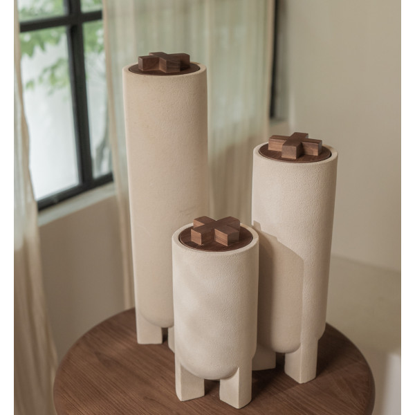 Bo vasen är en magnifik cylindrisk vas gjord av lokal sandsten från Java, handgjord av hantverkarna i DBoHDi. Den placeras på tre rektangulära sandstenben, i harmoni med vasens kropp. Ett vackert återvunnet teaklock, dekorerat med ett X/O-mönster, krönar Elin Vase. Bo Vase finns i tre storlekar: 12x12x26,5 cm, 12x12x36,5 cm och 12x12x46,5 cm. Det är ett elegant och tidlöst dekorativt föremål som kommer att ge en touch av sofistikering till ditt hem.