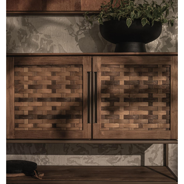 Omara Karma Pure s 4 vrati in 1 stojalom je visok kos pohištva, ročno izdelan iz predelane tikovine in železa, ki ponuja eleganten in vintage videz. Njegova štiri lepo teksturirana predelana vrata iz tikovine skrivajo osem odstranljivih notranjih polic za enostavno shranjevanje, spodnje stojalo pa je kot nalašč za prikaz vaših najljubših knjig ali drobnjakov. Železni okvir je končan v mat medenini. S svojimi dimenzijami 205,5 x 40 x 110 cm je ta kos pohištva idealen za prostorne prostore za shranjevanje.