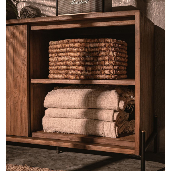 Omarica Outline je lep leseni kos pohištva s čistim dizajnom, ki se popolnoma prilega vsakemu prostoru. Narejen je iz predelanega tikovega lesa, ga podpirajo železne noge. S svojimi zaprtimi predelki in odprtimi policami so možnosti shranjevanja in prikaza neskončne. Merjenje 154x42,5x70 cm, je bogat in impresiven kos pohištva, ki bo vašemu domu dodal značaj
