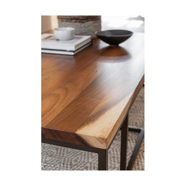 Pravokotnamizica Flare prinaša toplino v dnevno sobo. Edinstven je, ker je narejen iz masivnega lesa Suar in črne kovine. Ta rjava klubska mizica ima pravokotno obliko in meri 130x80x35 cm.