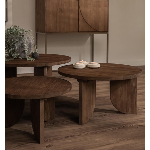 To je komplet klubskih mizic Ace, sestavljen iz treh medsebojnih miz z edinstvenimi in sodobnimi dizajni, elegantnimi grafičnimi površinami in tremi različnimi nogami. Te tabele so zasnovane tako, da dopolnjujejo pohištveno linijo Ace, lahko uporabite kot elegantno govorno točko v kateri koli spalnici ali sobi. Izdelani iz patiniranega, predelanega in obnovljenega tikovega lesa, so tudi pomirjujoči zaradi svoje etične in okolju prijazne proizvodnje. Dimenzije tabel so 55x65x75 cm, 55x65x75 cm in 30x35x40 cm.