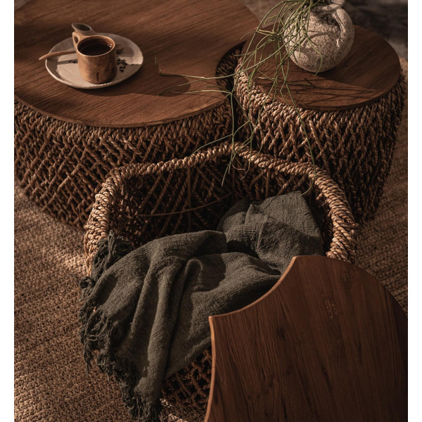 Komplet mizice Knut Padi A je odlična izbira za ljubitelje zabave in izvirnega pohištva. Navdihnjen s čudovitimi oblikami znanih indonezijskih riževih polj, se zdi, da je ta namizni set sestavljen iz ločenih miz, ko je v resnici en in isti kompaktni kos pohištva. Izdelana iz ročno pletene vrvi abake in recikliranega tikovega lesa je ta podloga trajnostna in okolju prijazna. Z dimenzijami 70x55x40 cm, 65x53x31 cm in 36x31x41 cm je ta miza kot nalašč za majhne prostore, hkrati pa ponuja velik prostor za shranjevanje. S kompletom klubske mize Knut Padi A dodajte edinstven pridih sloga svoji dnevni sobi.