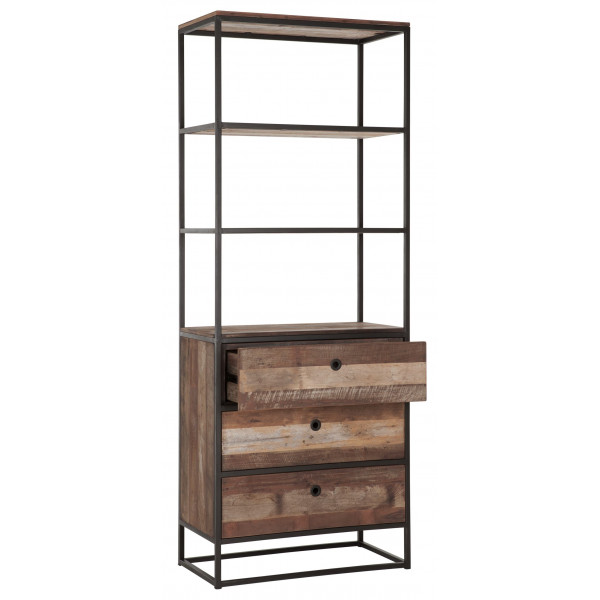 Knjižnica Touareg je izdelana iz recikliranega tikovega lesa in ima strukturo iz črnega kovinskega okvirja. Knjižnica meri 75x40x200 cm in ima 3 predale ter 3 odprte police.