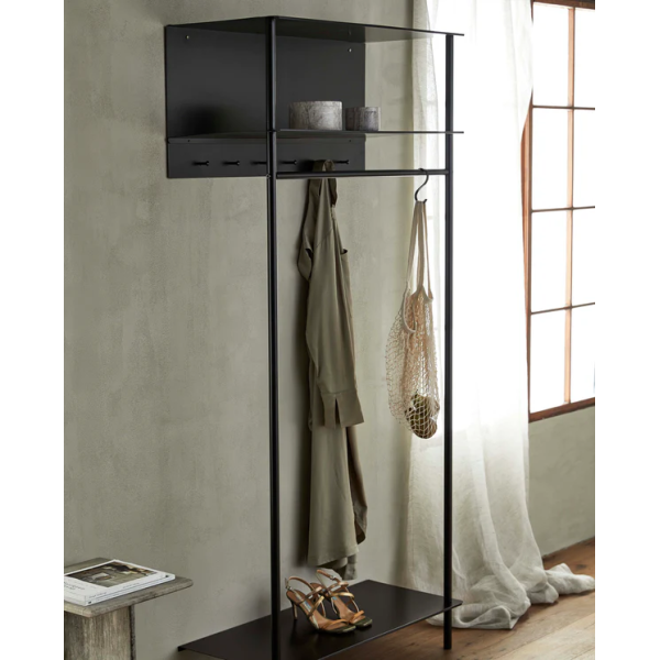 Ta stojalo Setun zagotavlja dodaten prostor za shranjevanje, ki oblačila lepo organizira s spodnjo polico. Narejen je iz železa s črnim prašnim premazom, je močan in trpežen. Meri 40 x 88 x 190 cm.