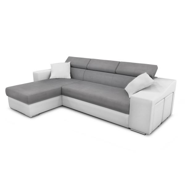 Ta velika obojestranska kotna sedežna garnitura Stilo bo vašemu notranjemu prostoru prinesla sodoben slog. Ponuja več funkcij, kot so funkcija postelje za dve osebi, velik predal pod ležalnikom in nastavljivi vzglavniki, da vam zagotovi največje udobje. Ima tudi fiksno nišo, ki omogoča shranjevanje dveh priloženih taburejev, da ponudi dodatni dve sedišči. Sedežna garnitura vključuje tudi dva blazina v enaki barvi.