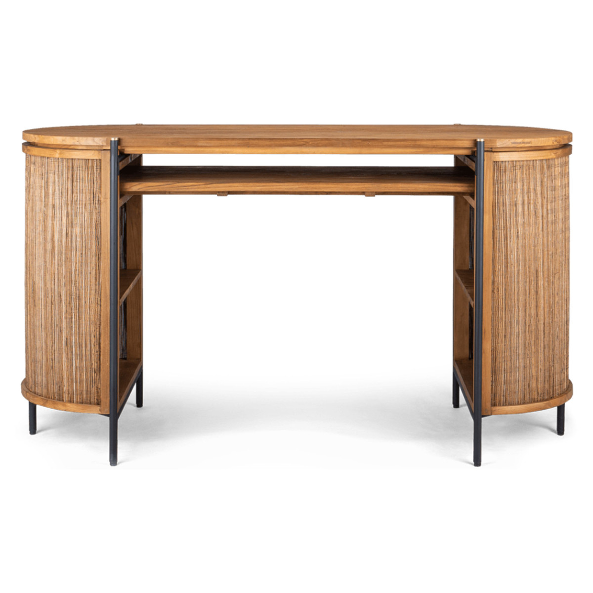 Mizna miza Coco je veliko več kot le miza, z bogato mešanico materialov ter edinstvenim in presenetljivim dizajnom. Vrh in okvir sta narejena iz visokokakovostnega predelanega tikovega lesa, okrogla, bogata pletenica pa je ročno izdelana iz osrednjega rebra kokosovih palmovih listov. Železne noge in podrobnosti dopolnjujejo prefinjen videz. Mizna miza meri 140x59x78 cm.