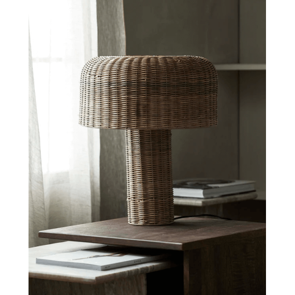 Namizna svetilka Atum je privlačen kos dekoracije pohištva. Ima stikalo za vklop/izklop in 2 m dolgo črno gumijasto vrvico. Njene dimenzije so ocenjene na ø40x50cm. Žarnica in osnova nista vključena.