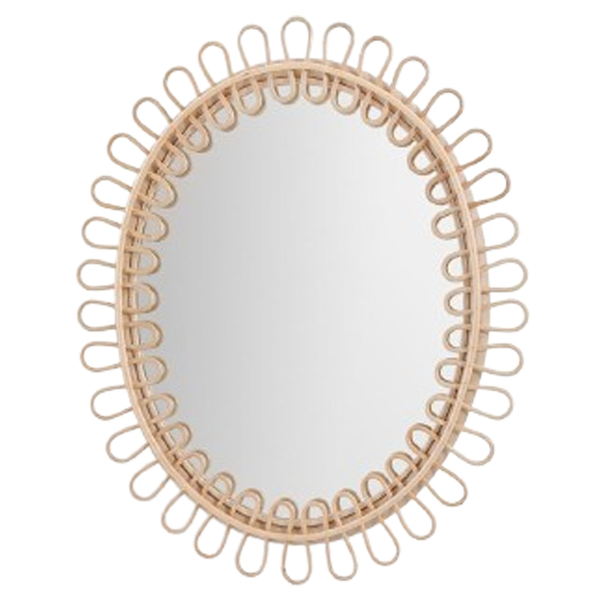 Zrcalo Luella, ročno izdelano iz trajnostnega indonezijskega ratana s strani usposobljenih pletarskih obrtnikov in stekla, meri ø57x68cm. Njegova izjemna prilagodljivost omogoča ročno obliko po parni obdelavi. Z naravnim odtenkom in ukrivljenim geometrijskim vzorcem to zrcalo združuje funkcionalnost in dekorativno eleganco.
