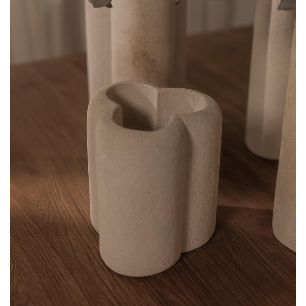 Ukrivljena vaza DBodHi je edinstven in lepo izrezan kos. Navdihnjena z obliko logotipa DBodHi, »detelja«, ki je sestavljena iz treh prepletenih valjev, ustvarja elegantno in presenetljivo vazo. Ročno izdelana iz lokalnega peščenega kamna iz Jave, ima vsaka vaza občutljivo žilasto lastnost, ki ji daje individualno barvo. Ta vaza je na voljo v štirih velikostih.