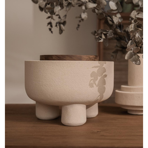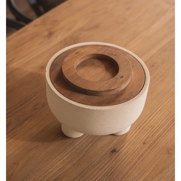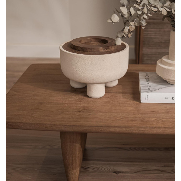 Paleta posod Elin je sestavljena iz globokih skodelic v enem kosu, ročno izrezljane obrtniki DBodHi iz lokalnega peščenega kamna iz blede Jave. Elin skledo je na vrhu s fino izrezljanim predelanim pokrovom iz tikovine, ki izpostavlja zasnovo X/O, značilno za črko O.